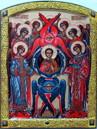 Икона на МДФ, фигурная, шпон (ясень), шпонки, полиграфия, декор.кайма, камни, лак.