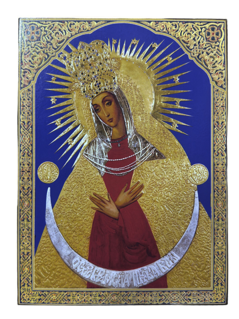 Икона на МДФ, шпон (ясень), шпонки, ковчег, полиграфия, декор.кайма, камни, лак.