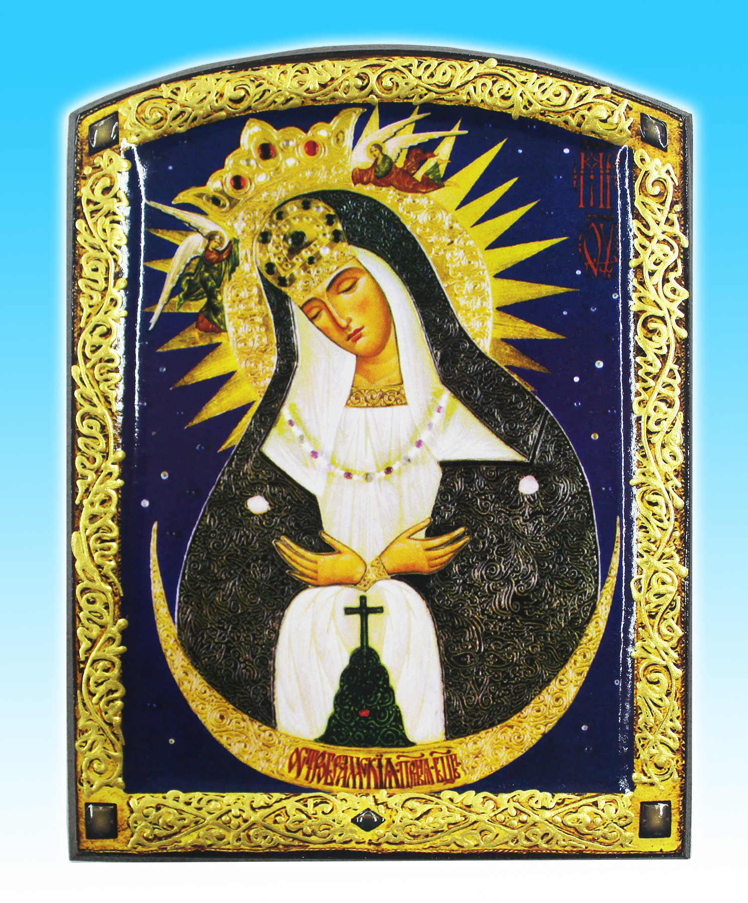Икона на МДФ, шпон (ясень), шпонки, ковчег, полиграфия, декор.кайма, камни, лак.