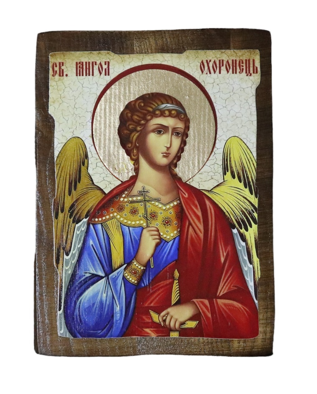Икона ручной работы, искусственно сделанная под старину, материал: дерево, литография, лаки. На оборотной стороне сургучная печать с символом Святой горы Афон. Упаковка конверт из мешковины.