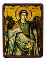 Икона ручной работы, искусственно сделанная под старину, материал: дерево, литография, лаки. На оборотной стороне сургучная печать с символом Святой горы Афон. Упаковка конверт из мешковины.