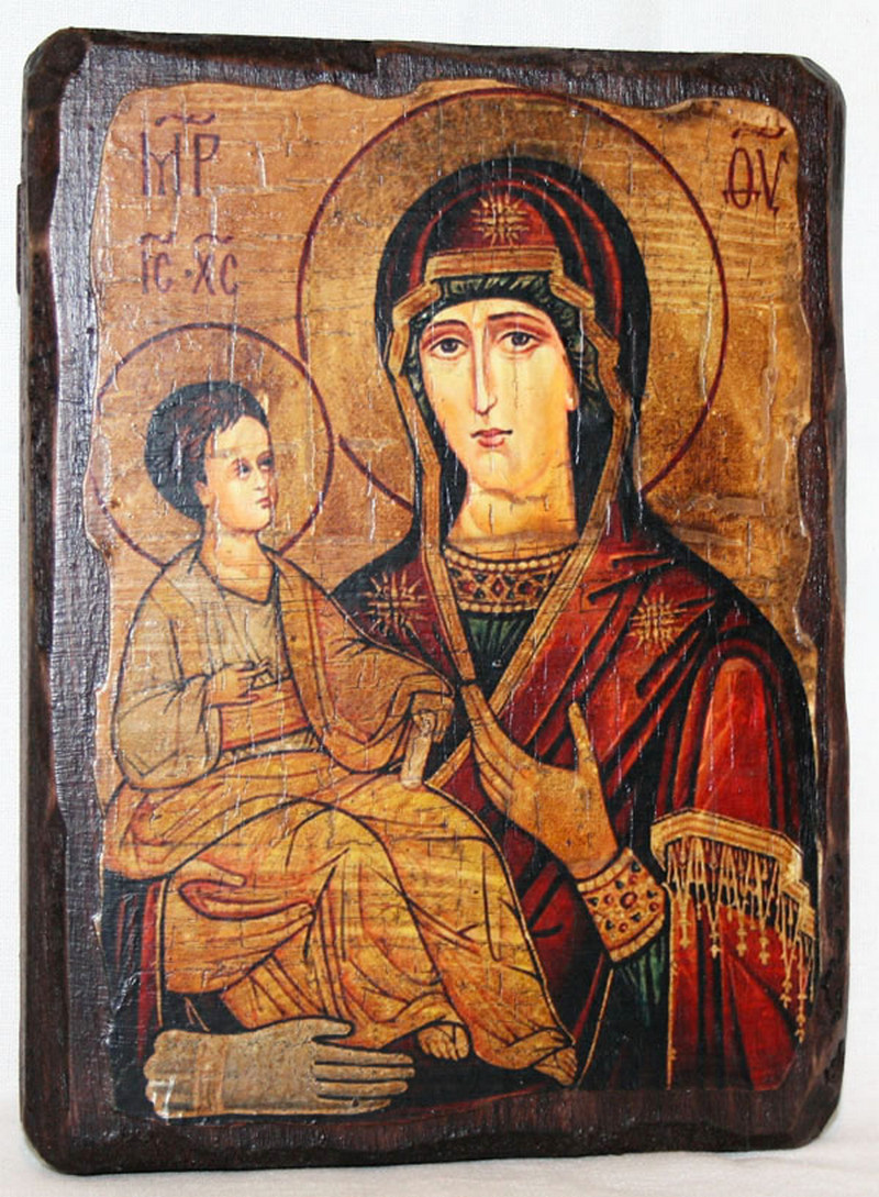 Икона ручной работы, искусственно сделанная под старину, материал: дерево, литография, краски, золочение, лаки. На оборотной стороне сургучная печать с символом Святой горы Афон. Упаковка конверт из мешковины.
