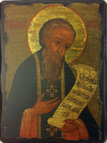 Икона ручной работы, искусственно сделанная под старину, материал: дерево, литография, лаки. На оборотной стороне сургучная печать с символом Святой горы Афон. Упаковка конверт из мешковины.