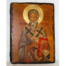 Икона ручной работы, искусственно сделанная под старину, материал: дерево, литография, лаки. На оборотной стороне сургучная печать с символом Святой горы Афон. Упаковка конверт из мешковины.