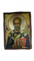 Икона ручной работы, искусственно сделанная под старину, материал: дерево, литография, краски, золочение, лаки. На оборотной стороне сургучная печать с символом Святой горы Афон. Упаковка конверт из мешковины.