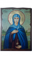 Икона ручной работы, искусственно сделанная под старину, материал: дерево, литография, краски, золочение, лаки. На оборотной стороне сургучная печать с символом Святой горы Афон. Упаковка конверт из мешковины.