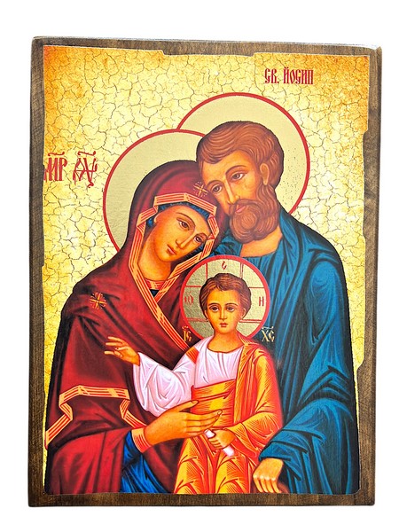 Икона ручной работы, искусственно сделанная под старину, материал: дерево, литография, краски, золочение, лаки. На оборотной стороне сургучная печать с символом Святой горы Афон. Упаковка конверт из мешковины.