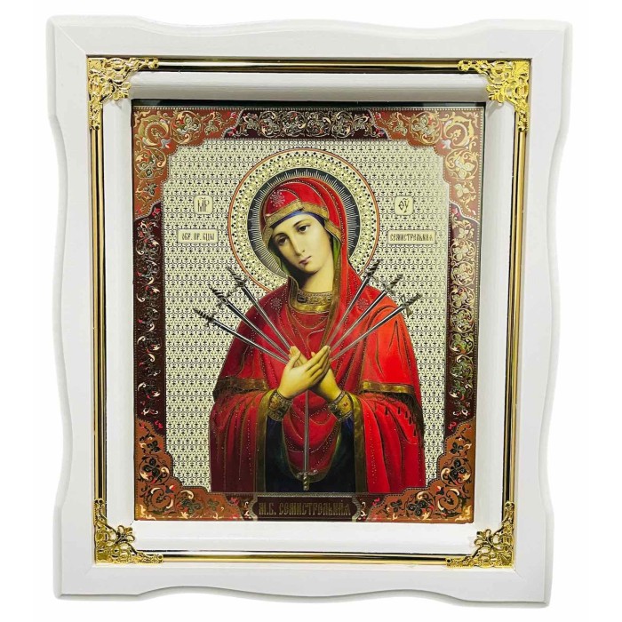Икона Пресвятой Богородицы "Семистрельная" белая рамка, золотые углы ↕25см ↔22см