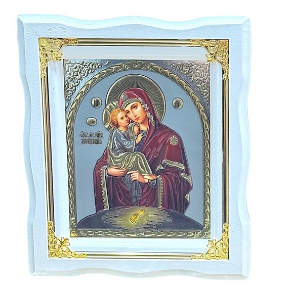 Икона Пресвятой Богородицы "Почаевская" белая рамка, золотые углы ↕25см ↔22см