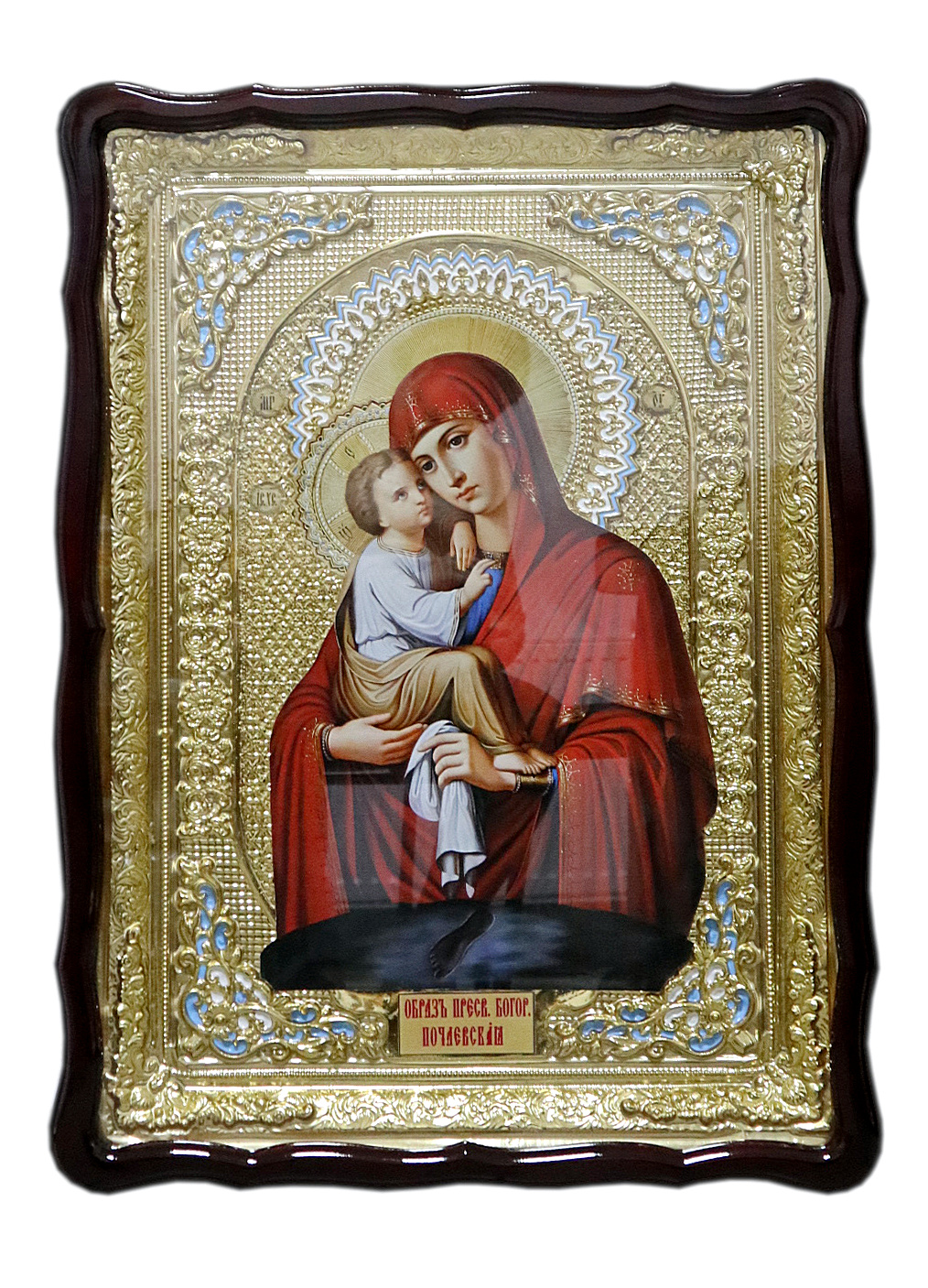 Почаевская икона Божией Матери в ризе с эмалью 60х80 см