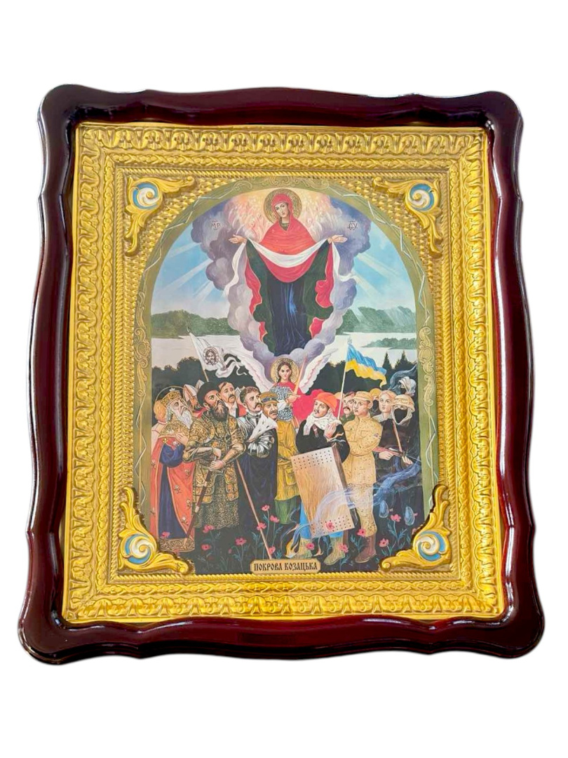 Храмовая икона Покрова Козацкая икона Божией Матери в ризе под стеклом