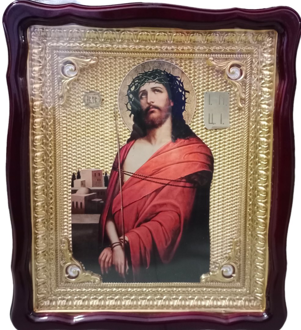 Храмовая икона Иисус Христос в терновом венце в ризе под стеклом