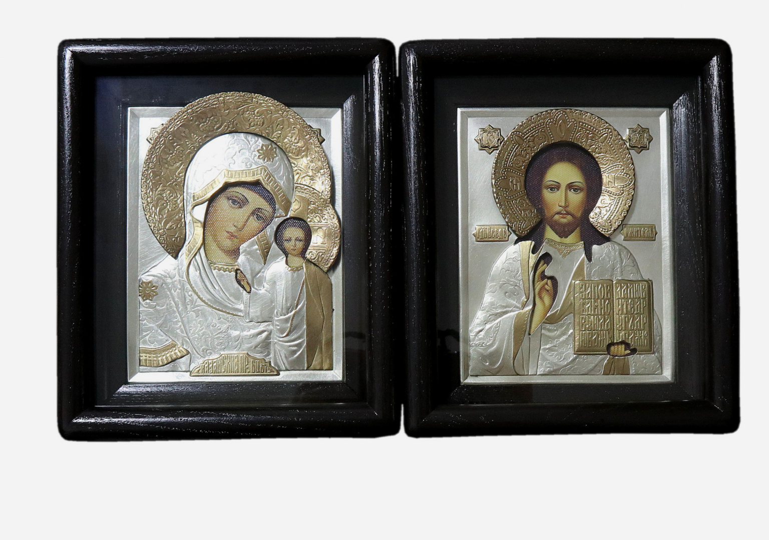 Оклад Иконы изготовлен из меди-гальваническим путем,с дальнейшим нанисением серебра и позолоты, поверхность которых покрыта специальным лаком,в результате чего,серебро не тускнеет, а позолота не блекнеет. Киот и багет Иконы выполнен из натурального дерева.