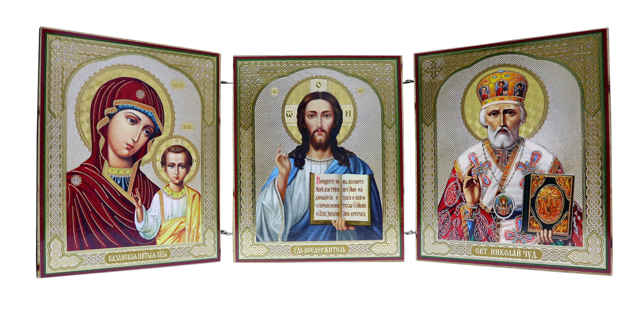 Икона-складень тройник Вседержитель, Казанская,Николай 10/12