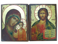 Икона ручной работы, искусственно сделанная под старину, материал: дерево, литография, краски, золочение, лаки. На оборотной стороне сургучная печать с символом Святой горы Афон. Упаковка конверт из мешковины.