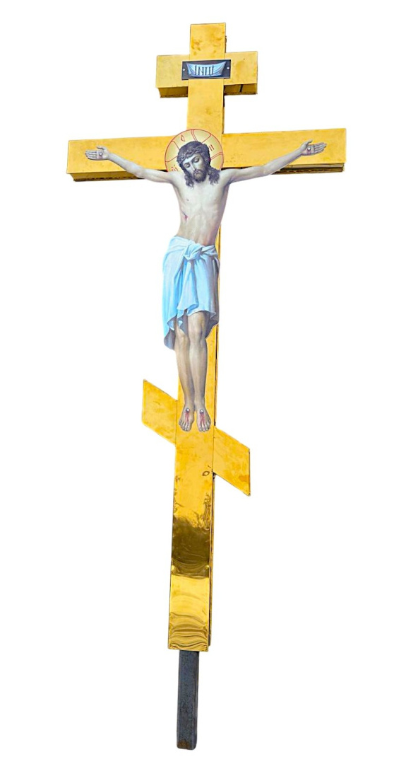 Крест выполнен из булата желтого цвета, распятие – печать на ПВХ.