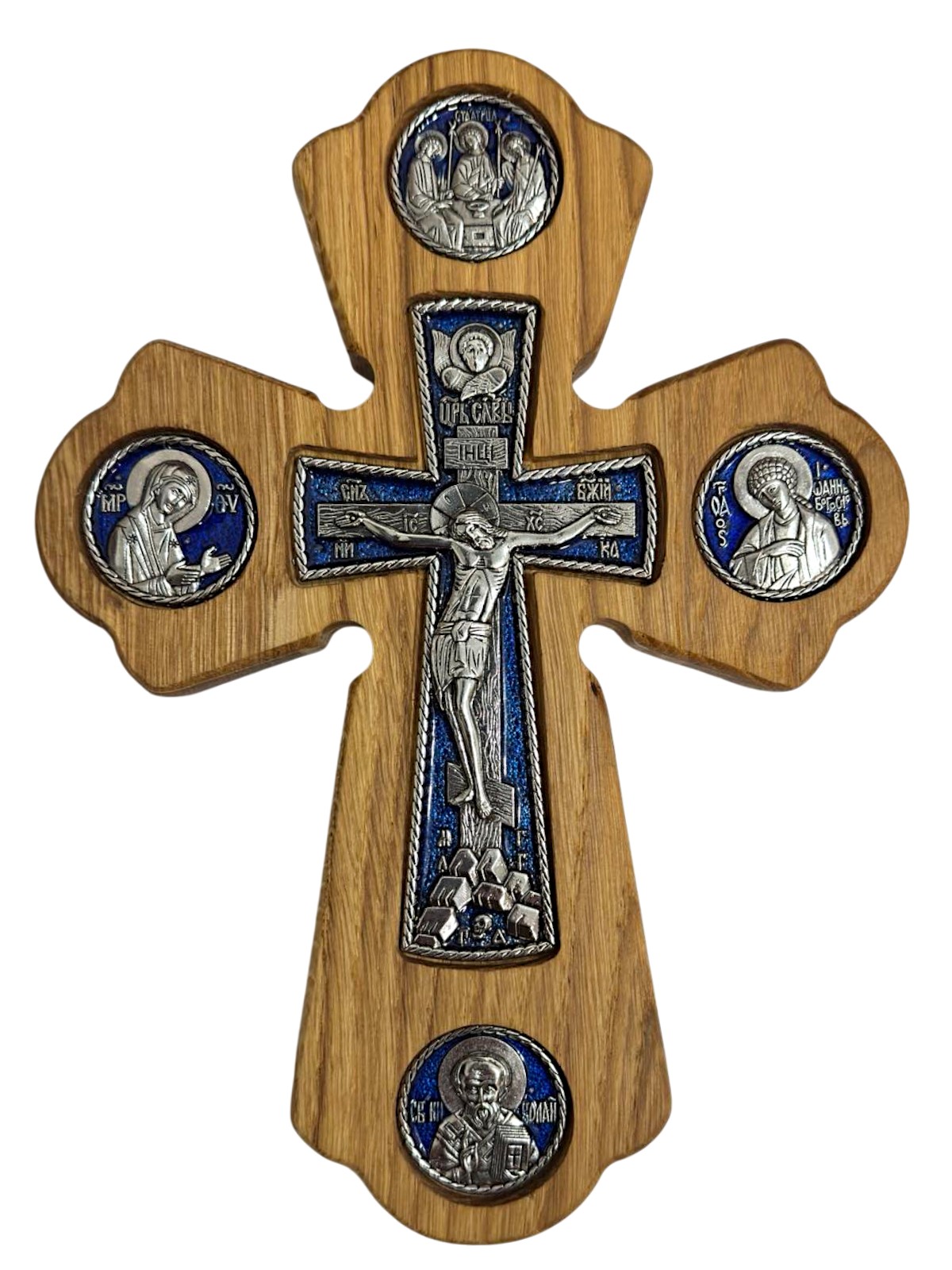 Крест деревянный фигурный (синяя металлическая вставка) 17/23см