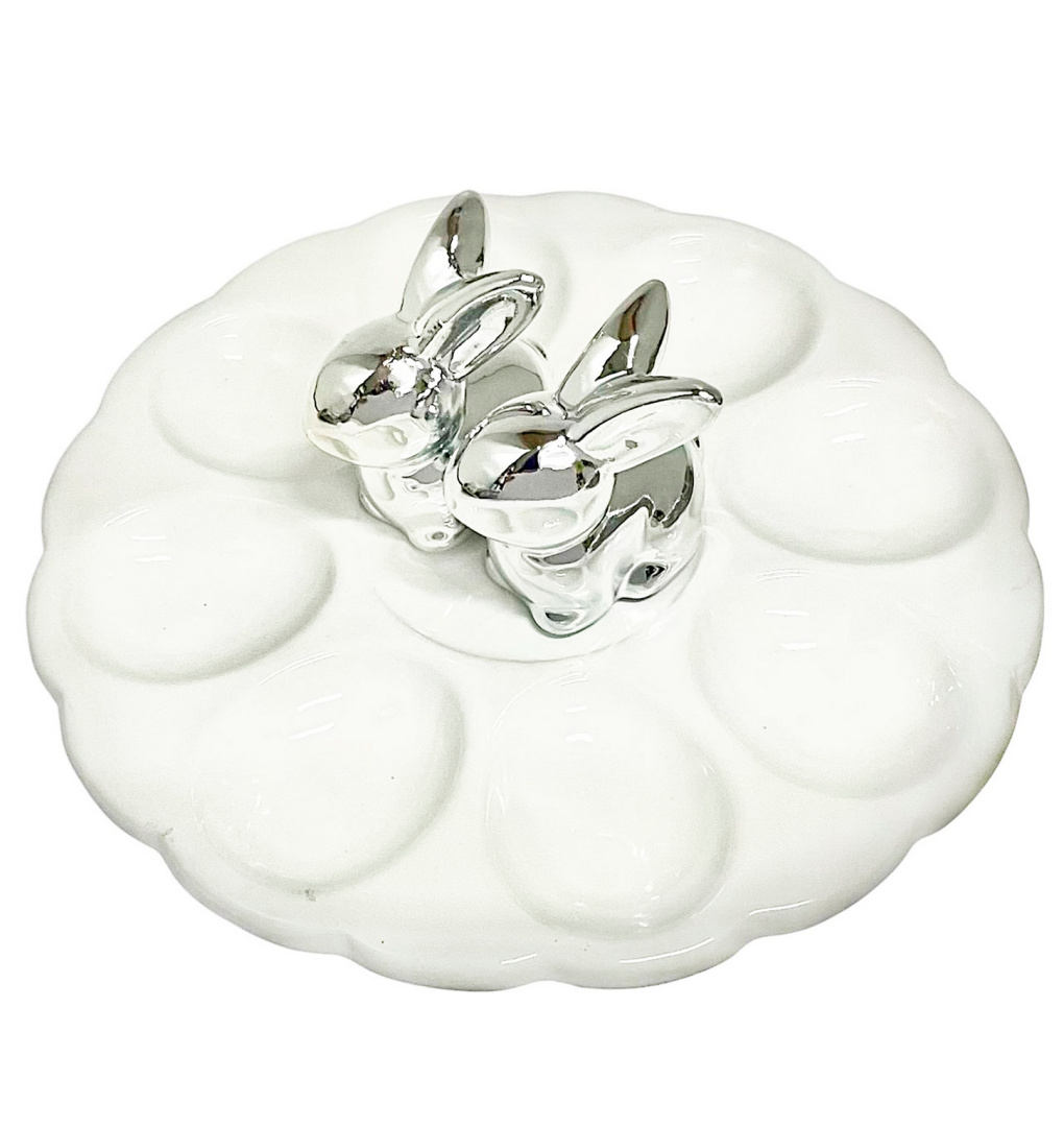 Тарелка подставка под пасхальные яйца керамика (серебряные зайчата)