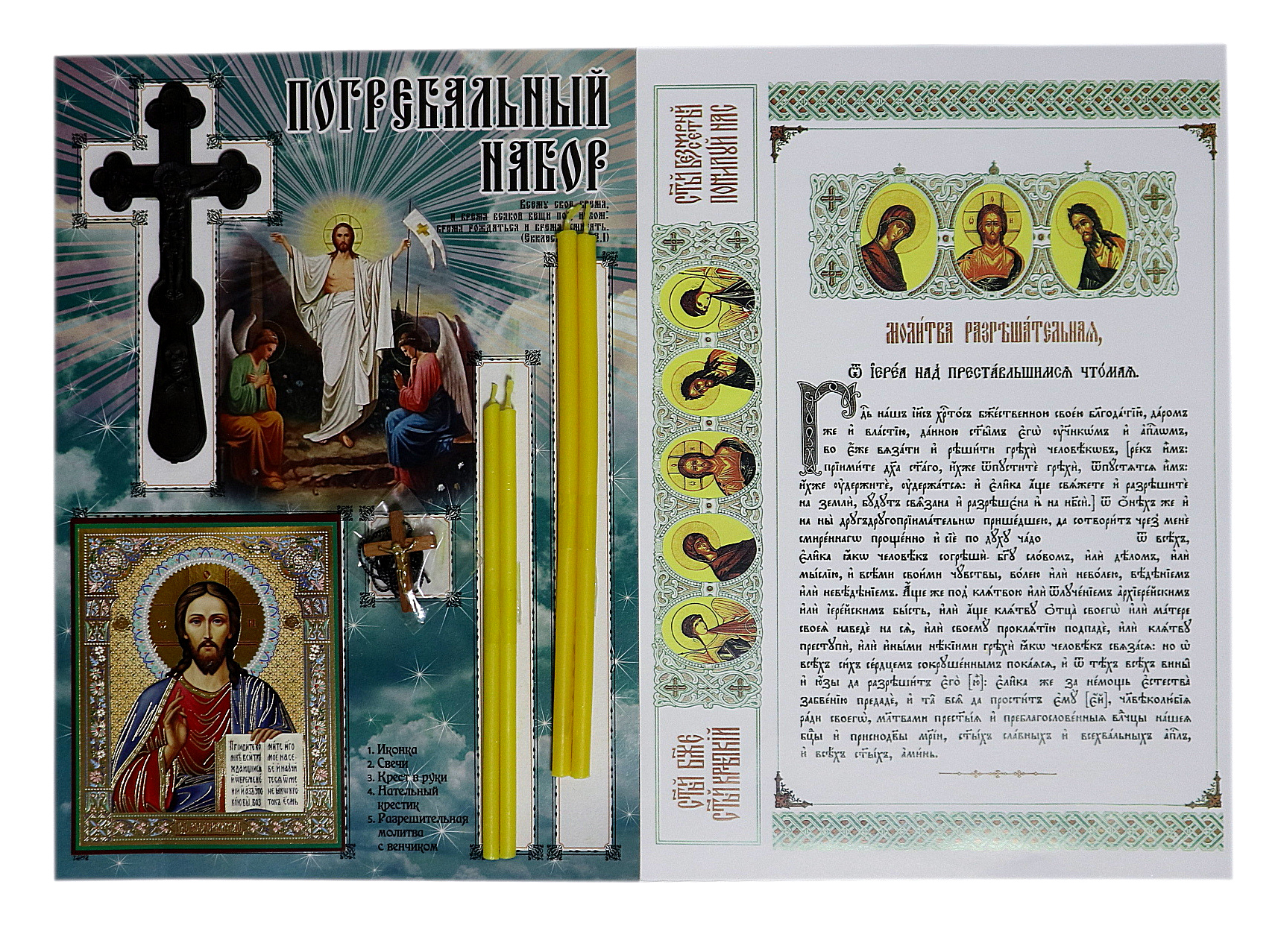 Икона, крест в руку, крест нательный, свечи, розрешительная молитва.